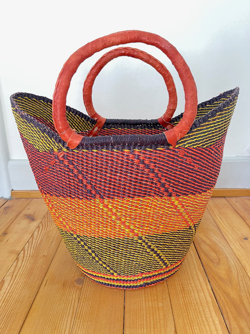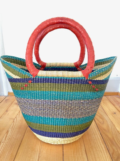 Unsere Einkaufstaschen aus Ghana sind handgefertigte Unikate aus robustem Savannengras. Mit stabilem Boden und doppeltem Lederriemen sind sie langlebig, leicht und angenehm zu tragen. Ob für den Einkauf, den Stadtbummel oder als Picknicktasche – die Bolga-Einkaufstasche vereint Vielseitigkeit, Nachhaltigkeit und zeitloses Design. Mit jedem Kauf unterstützt du faire Bezahlung und ein soziales Projekt für die Dorfgemeinschaft in Ghana.