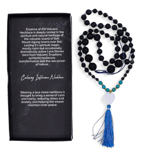 Die Vulkanenergie Halskette – Beruhigende Wirkung vereint erdende Lavasteine mit einer zarten, hellblauen Quaste, die symbolisch für Frieden, Gelas...