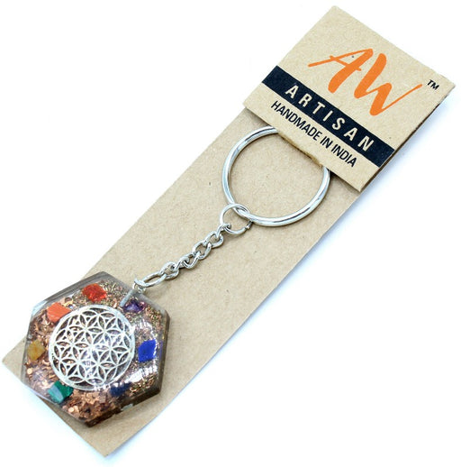 Der Octagon Flower of Life Orgonite-Schlüsselanhänger kombiniert farbige Edelsteinchips, feine Metallspäne und transparentes Harz in einer harmon...